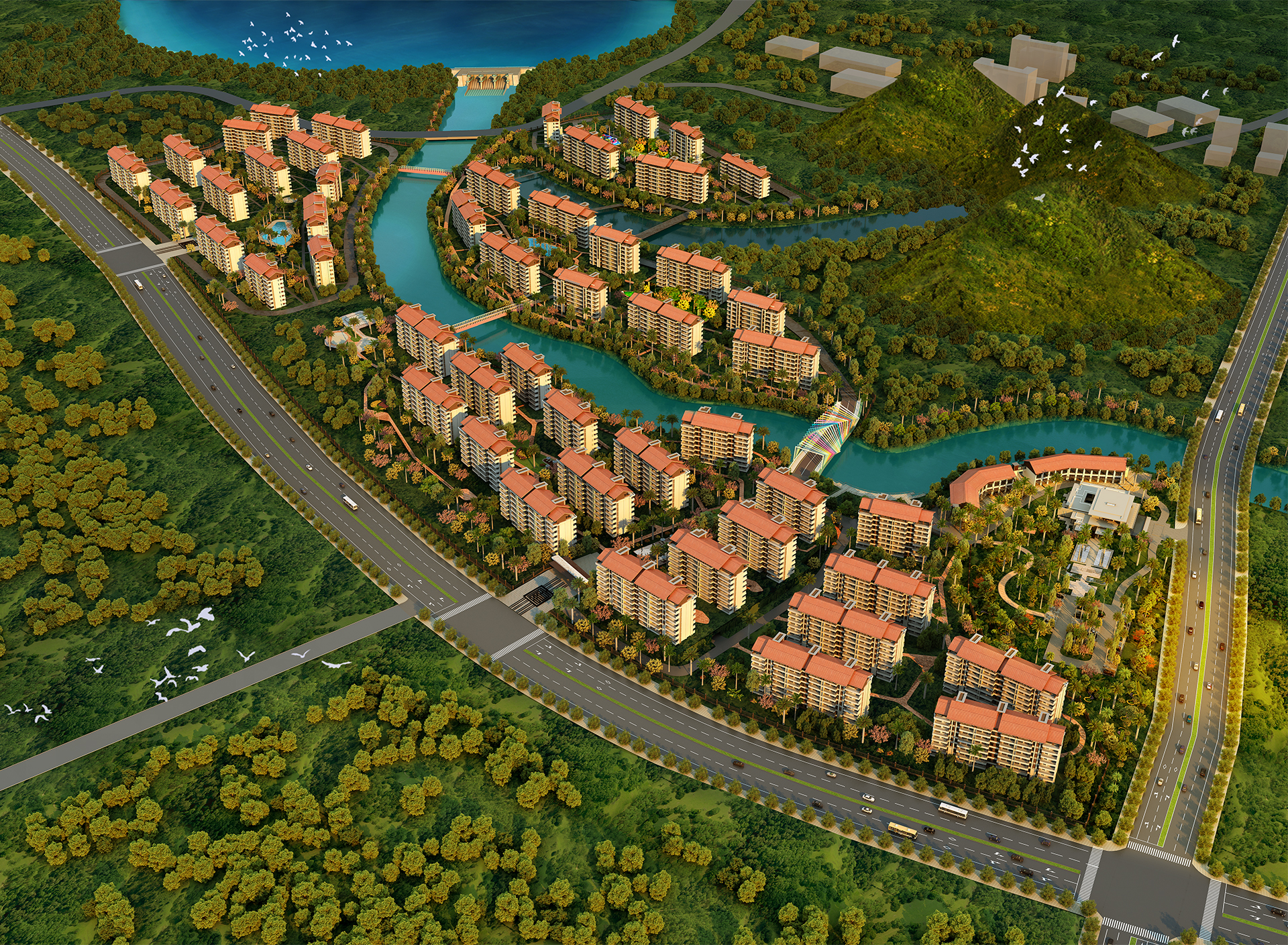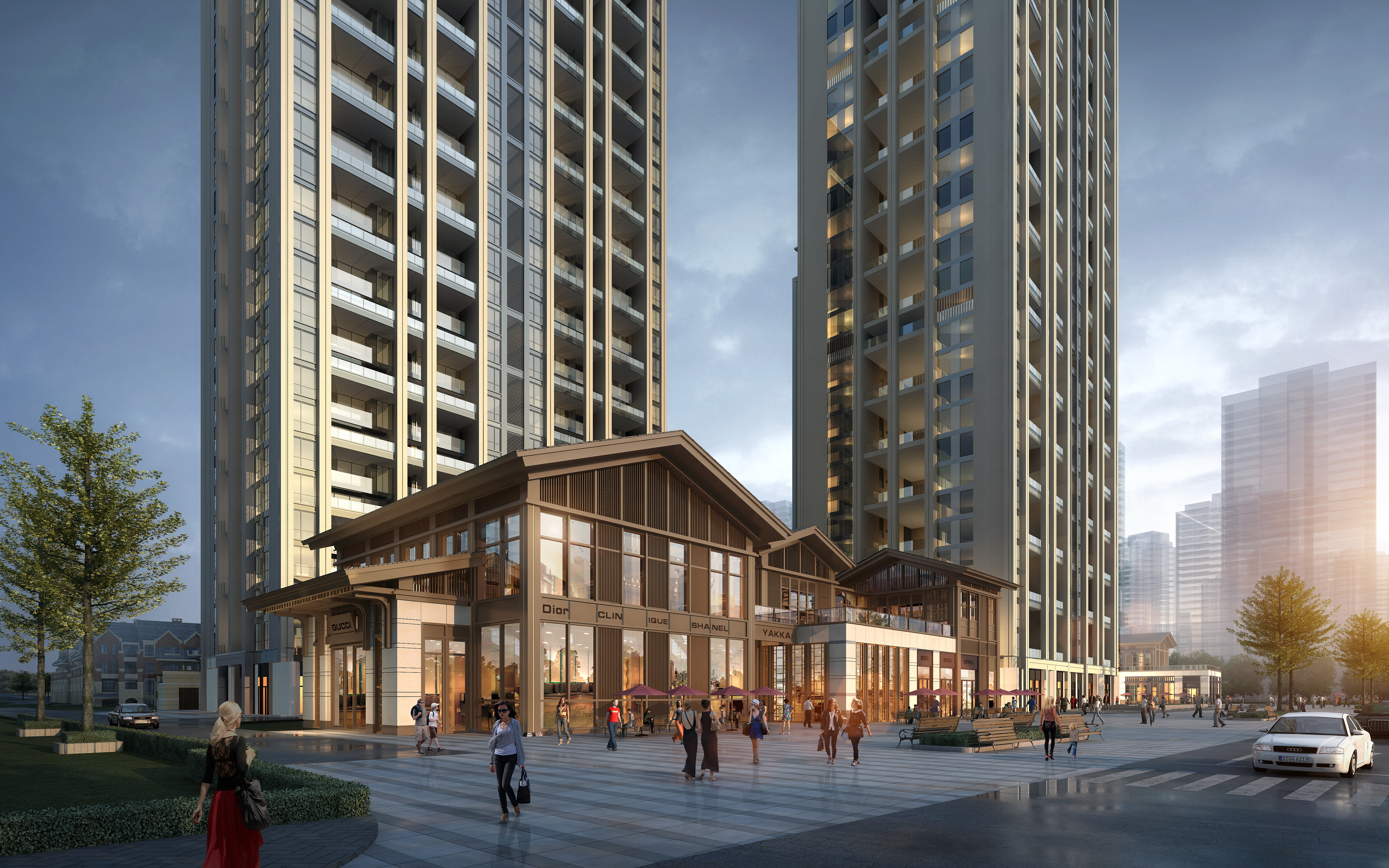 其中項目5號地位于長白中路與長白三街交匯北側處,由2棟24層高層、6棟7層洋房和部分底商組成;2-3-4號地位于勝利大街與長白中路交匯處。其中2號地由兩棟29層高層組成和濱水商業組成;3號地由1棟29層和1棟28層高層和濱水商業組成,;4號地由1棟17層,2棟22層,1棟18層高層和濱水商業組成。4個地塊獨攬長白內河1.0公里水岸線,擁有水域面積過12萬平方